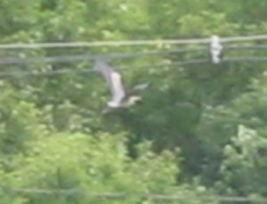 Now, after more sightings, and with those features absorbed in my mind and familiar, what leaves me dumbstruck still is her wingspan and the structure of her wings. While they lay flat by her side when not in use (as they were the first times I saw her), they unfold for flight into perhaps five feet in span, and they have a remarkable width. The wings also have a crook or elbow, leaving the outer expanse to appear limp as the wing rises in stroke. Watching them in action, you can imagine the power of the thrust forward as the air finally catches under the outer segment of wing on the down stroke.