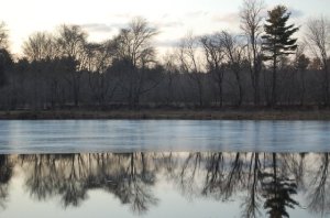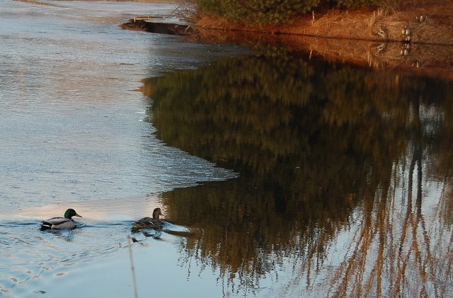 This week the pond officially entered the spring season.While birds have been chirping wildly for a week or so, on Tuesday, a pair of mallards arrived and skirted their way alongshore, as a sheet of ice still ran the inner length of the pond.