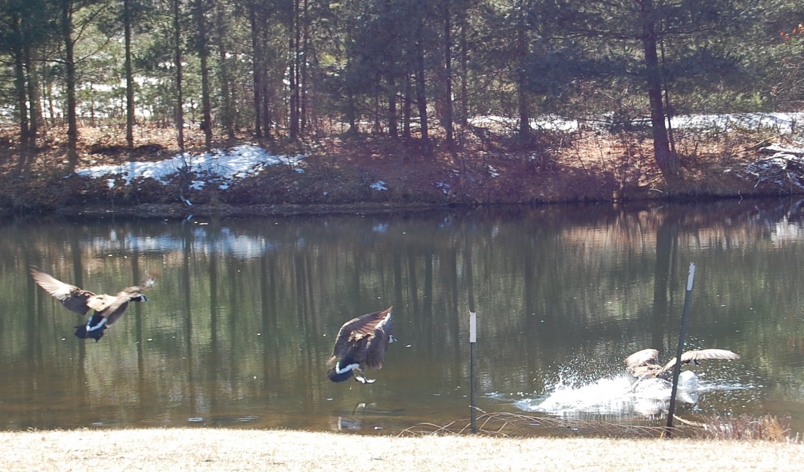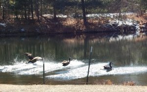 As I reached the far end of the pond, I happened upon a flock of geese grazing on the lawn. They gave their usual racket of honks, warning each other of my presence. As I walked closer to them, some startled, taking a short thirty foot flight to the water. I was able to get a wonderful photo that shows the progression of ‘landing approach’, about which I mused earlier in the week. It may just be that there is a method to the splashdown. Although, since this was not a landing at full speed, it was a more gentle water entry than the chaotic scene when they dive in from high above. But, it allowed for a good representation of what the phases of landing are. It must be the webbed feet that cause the initial splash and skid to a halt, which is continued by the rest of their body’s landing. You see here that there is a fair amount of white water, even with a simple entry.