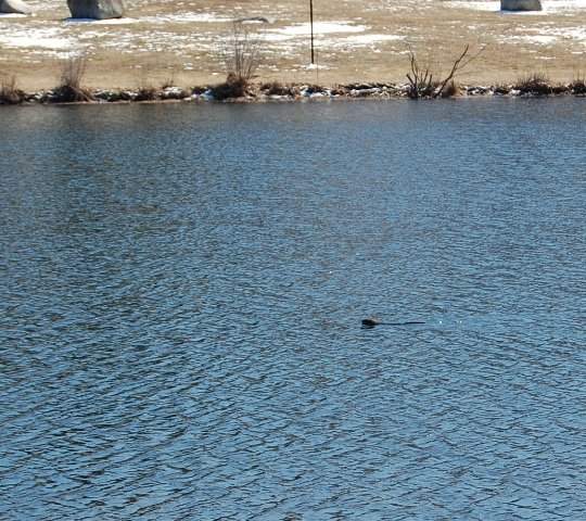 Following his path with my eyes, I quickly walked to the end of the pond, hoping to meet him near the island, where I might get another photo. But, he submerged and did not reappear. I suspect he scooted into one of the little caves along the waterline of the island.