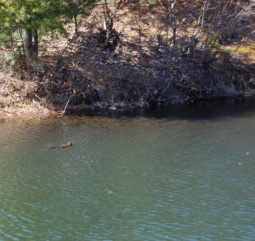 If what it carries in its mouth is food or supplies for nesting, I would think it’s a parent animal, tending to its family. And, something about its look today made me question whether or not it’s a beaver. Here’s the best photo I was able to shoot today. Be sure to enlarge it for clarity.