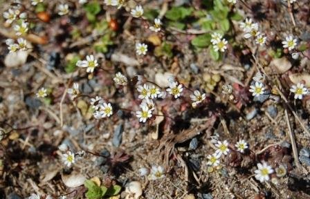 Today reminded me why I so love the pond! As I walked the path, I could see tiny white blossoms, growing barely half an inch above the ground, quivering in a gentle breeze. They have emerged through a layer of scraggly remains of last year’s grass and debris. Their delicate composition belies what they have endured to present their beauty today. Amazingly too, bees hovered over them. (All photos in this article require seeing enlarged. Click on the photo – then, use the back arrow to return to the post.)