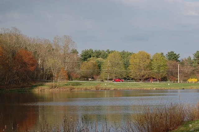 A street runs along one end of the pond. Generally, I try to avoid having passing vehicles in my pictures. But,some days ago, there was a beauty of a red truck going by as I took a long shot of the pond. As I looked through the lens, I had the sense that time had zipped back to another era, like, the late 50’s.