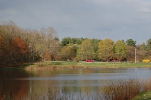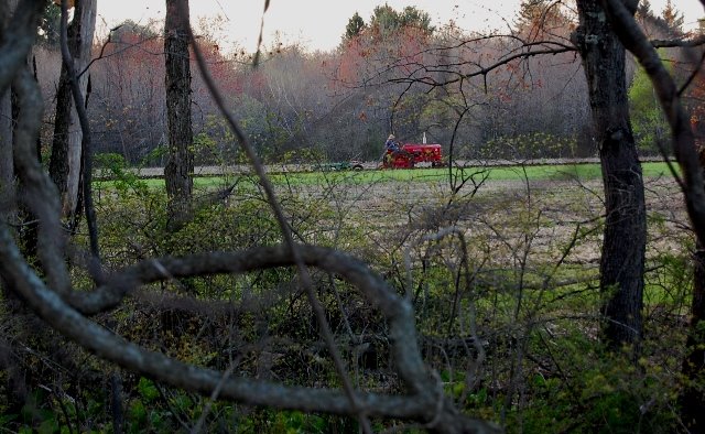 Yesterday’s weather was so summer-like, I decided to go for another quick walk around 7:30 p.m. Although it was still quite light out, as the next half hour passed, it became more difficult to get the lighting I needed for any photos. This was frustrating, since, alongside the pond, there is a two to three acre field, which someone, on a red tractor, was plowing. A grove of trees (entwined with Concord grape vines) and a stone wall on a bit of a rise separate the pond and the field. The tractor, especially its color, distracted me from the pond. I wish you could hear the sound of the scene captured above – the drone of an engine’s labor in the quiet of the end of a day. (I was able to take this picture by capturing light from the sky, which fools the camera – and me – in its ability to put light into the shot. It was nearly too dark to see the tractor when I took this picture.)