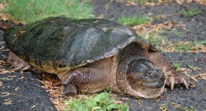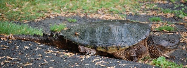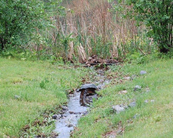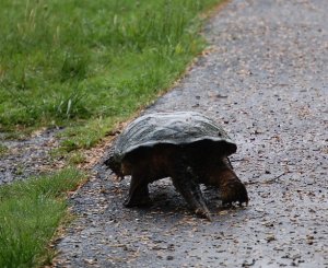 As I began my drive out the driveway, I saw a huge turtle on the path to the pond!!! It was walking, raised some inches from the ground, as you see above. I put the car in reverse, parked it, hurried into the house for my camera, and ran toward the pond. These photos show an ancient snapper, the shell of which was about fifteen inches across. Click on the photos to enlarge.