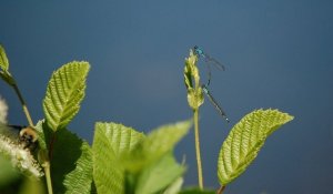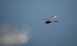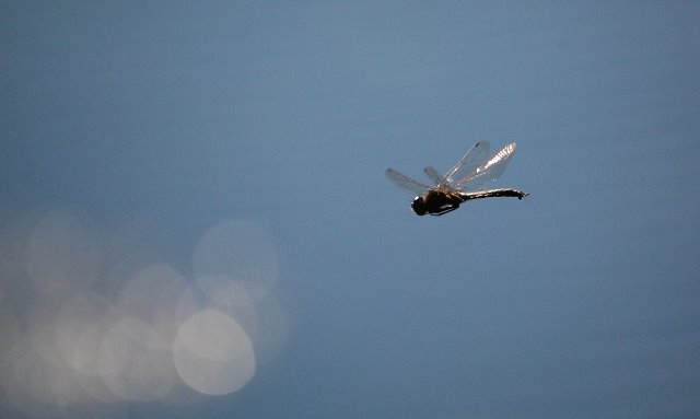 With the photo below, I’m showing off my photography skill. I stood for at least 15 minutes trying to catch a dragonfly in flight. Here it is, over the sparkling water! Unlike the black and white dragonfly above, this one would hover for the briefest instant now and again. It was during a hover that I was able to quickly get it into focus, and shoot.