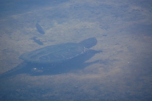 As the noon sun shone bright overhead, a six inch fish faced off with a fourteen inch turtle. The turtle had settled in the fish nest and I wondered if it was a threat to the eggs I imagine the fish is protecting. The fish would lunge at the snapper, trying to send it on its way. The turtle took its sweet time, but finally moseyed along.