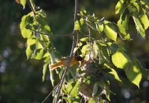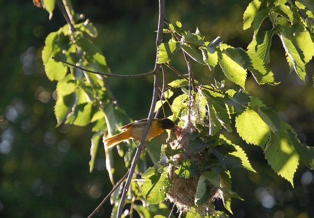 In the evening sun, as her chicks swayed in their sack nest, the mama Baltimore Oriole alighted, bringing dinner to her babies.