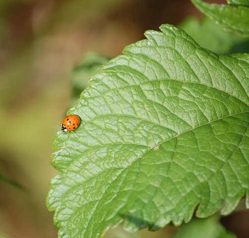 In shape and color the little beauty below most resembles the Nine-spotted Ladybug Beetle. Watching it poke around the parameters of this leaf took me back to the wonder of my childhood.