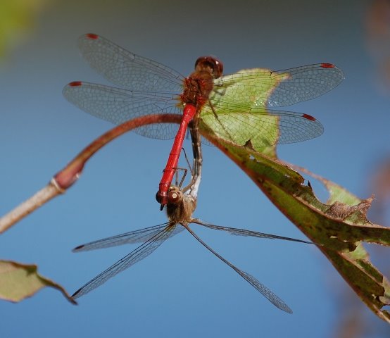 Now about the couple…they are really stuck on each other. They not only sit in pose like this, but fly in the same posture. I don’t like to wonder if the under-fly is actually alive. It doesn’t move a wing. It just hangs in frozen suspension. Hmmm… But see its little arms gripping? The couple zips around the pond going from plant to plant stopping, I presume, for leaf nibbling. But again I wonder, why does only the upright one get to eat?