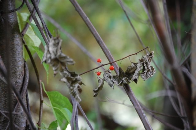 I’ve been told that it’s the first frost that causes the shell to strip back from the inner berry. In the image below I see frost damage in the black of the leaves, but truly, that’s a guess. Please enlarge this photo for full appreciation. (Click on it, then after viewing, click on the back arrow to return to the post.) Hiding midst the chocolate brown of the surrounding evergreen trunks and the entwining vines they host, these three red berries are an striking contrast.