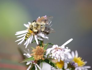 The photo below marks a progressive step in my photography. The well achieved focus of the black dotted bug, which is not much more that one-quarter inch in length, was neither luck nor skill, but instinct. I had my camera on the bee when in a sliver of a second, motion caught my eye. With the camera and me working as one, attention shifted left and, click, the D40 performed beautifully, refocusing (it was set at auto) and showing us this little beauty, which was gone by the time I moved the camera from my eye to see it for real. This is another photo that is best seen enlarged. The bug is a Spotted Cucumber Beetle.