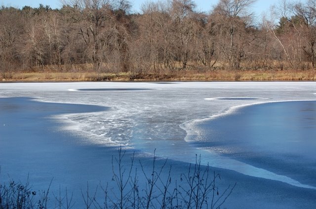 What I’m most pleased to share in this blog is that I captured the noise on (digital) film! How, you wonder? On one side of the pond are little unfrozen circles, about eight inches in diameter, that I believe remain unfrozen because of bubbles that rises to the water’s surface with enough frequency that the water isn’t still enough to freeze.