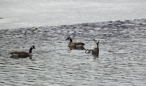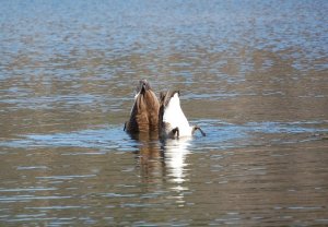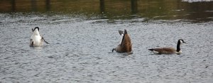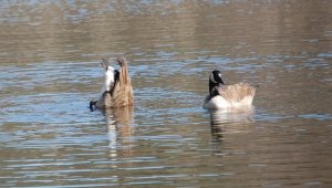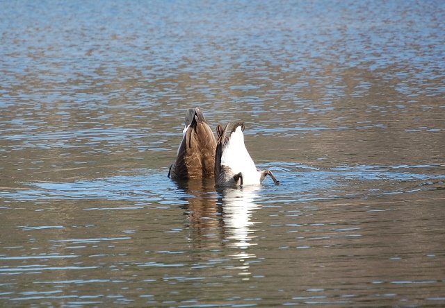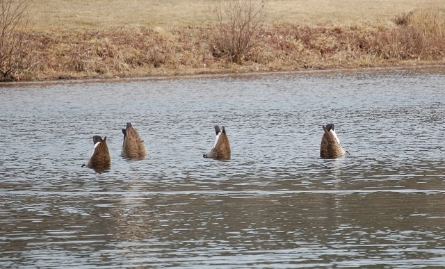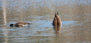 The Canada Geese that arrived at the pond this week (along with the Mallards), seem to be having a welcoming of spring celebration of their own as they dip their beaks to the pond’s floor and feast on whatever it is they find there, and in so doing present their rear ends to the sky!