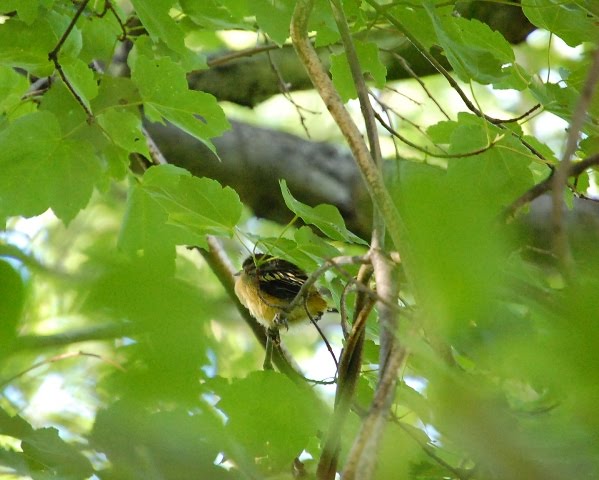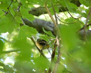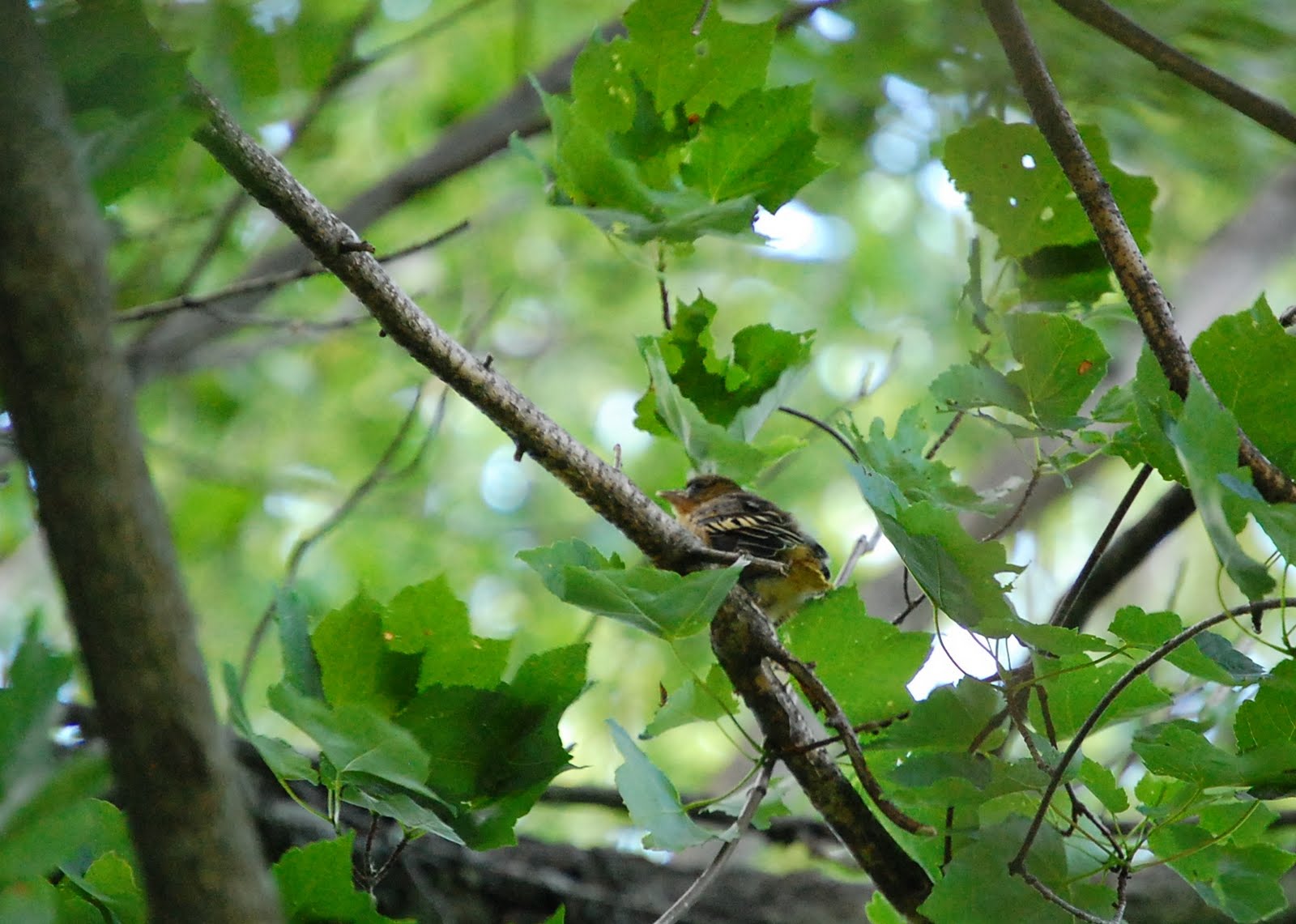 I found the Baltimore Oriole’s nest empty today when I went out for a walk. But in the thicket of trees alongside where the nest is, I heard much Oriole calling. It was dark in the thick tangle of branches, so at first I thought it was the parents celebrating their freedom.