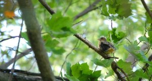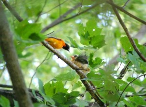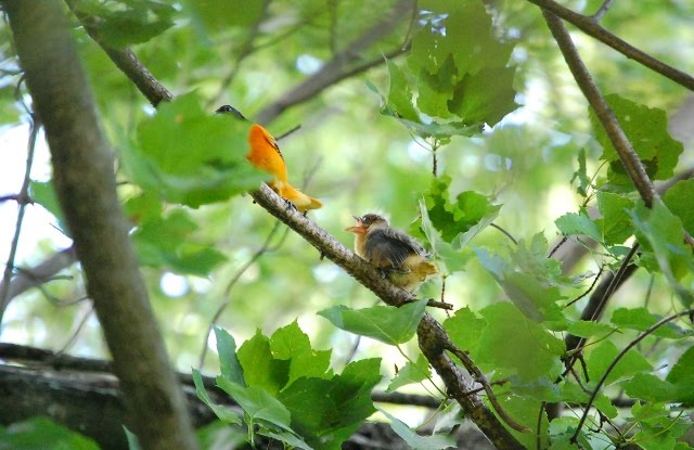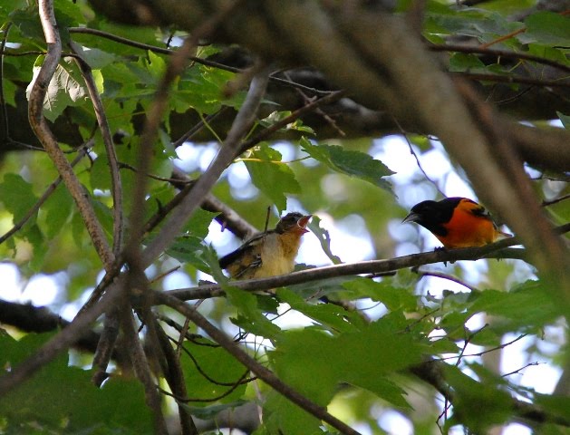 But after setting my camera’s exposure compensation to 0.03, the photo above is what I saw – the father Oriole with a fledgling, mouth wide open begging for food or to be returned to the nest. Note its little claw gripping the twig.