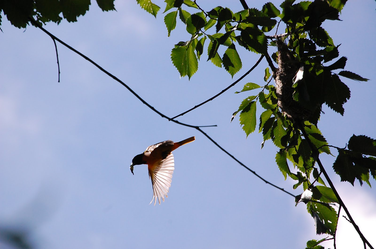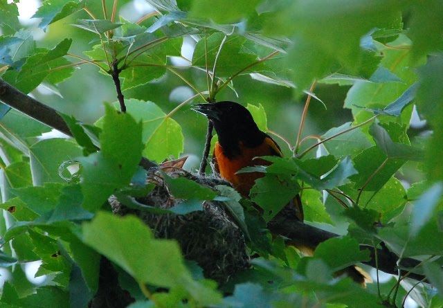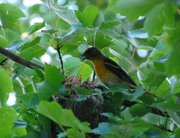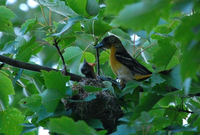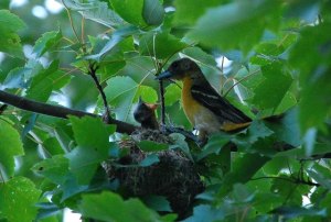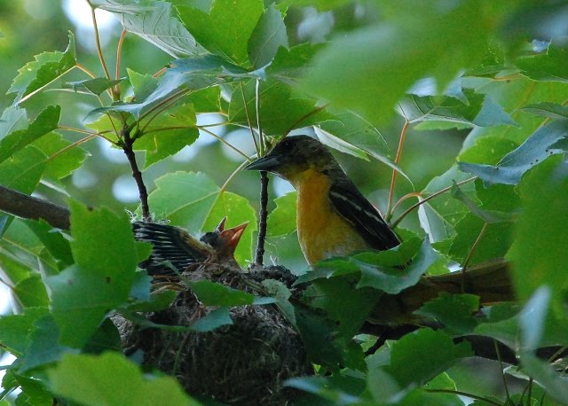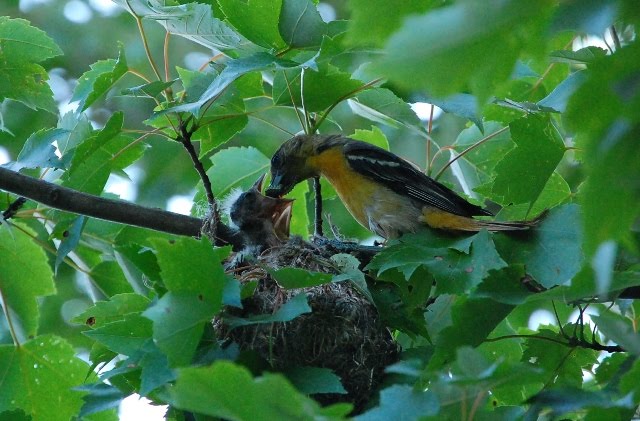 Such care is given to baby birds. During prime feeding season (which seems to go on for two weeks for the Baltimore Oriole based on my observation this June), the mother and father frequent the nest with food every six to ten minutes. Sometimes both parents arrive, back to back.