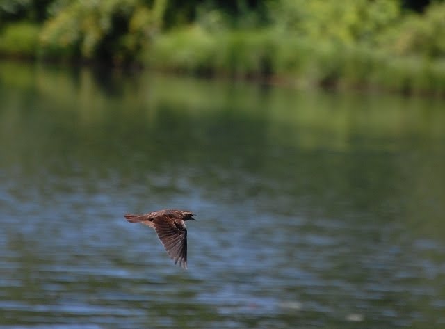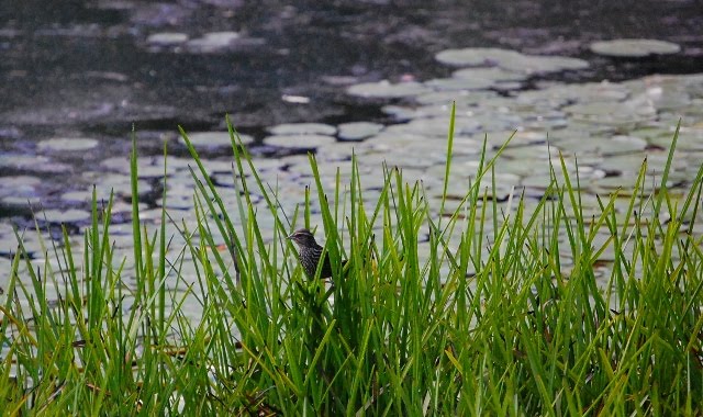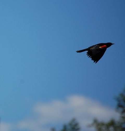 UPDATE: Today, the day after I posted these images and the text below, my thoughts that there were Red-winged Blackbirds fledglings in some of the images below was confirmed. As I walked around the corner where the birds had been yesterday, the male was alone in the lawn. As soon as he saw me, he flew directly toward me and into a thicket of trees to my right. His call was constant. In an instant, the female flew from where he’d entered the trees and she glided down into the reeds along the shore of the pond. The male came along behind her and dropped into the same spot in the reeds. Then the female/mother flew up from the reeds and back into the trees. Immediately, the male/father rose from the nesting area with four fledglings flying alongside him. They flew over a stretch of the pond, and up to where they were against a background of blue sky, then into the trees from where the female called to them.