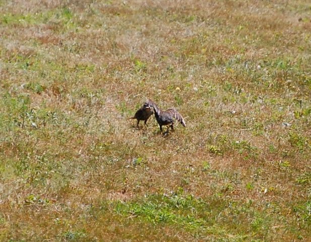 I insult them by using the word “goofier,” because, in fact, their flying skills have been remarkable for their age. It’s just that there seemed to be an awful lot of hop/flying going on, as well as some roll and tumble landings. (Or, this could be the mating postures of the female…)