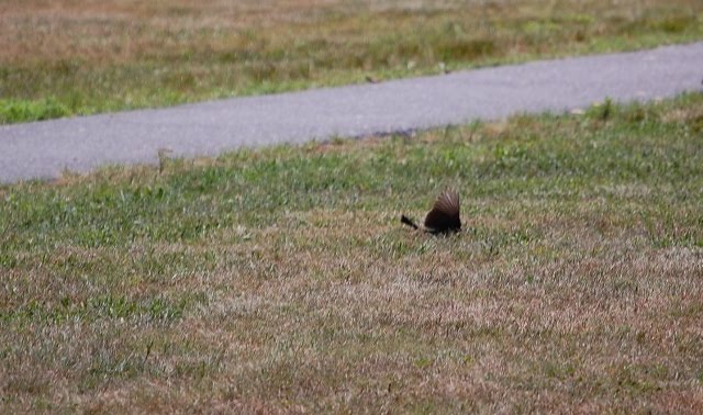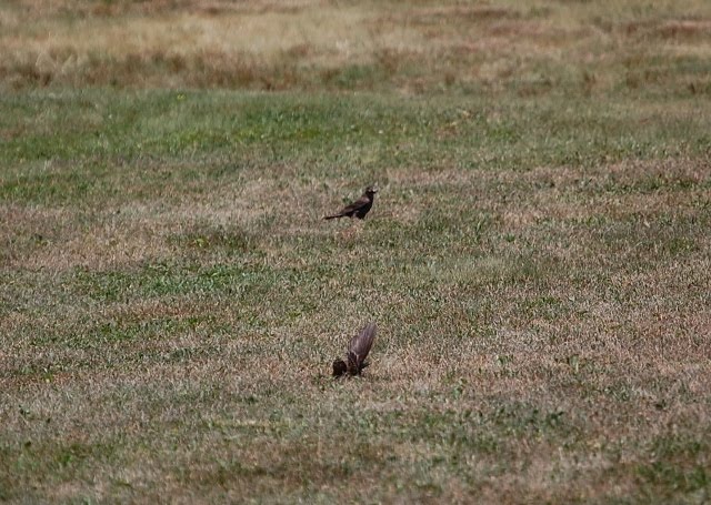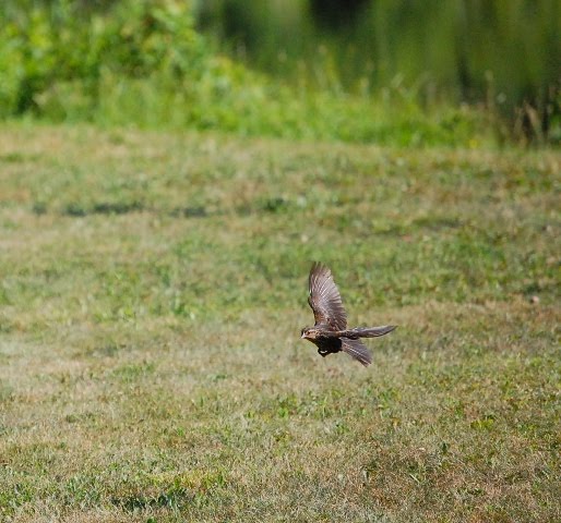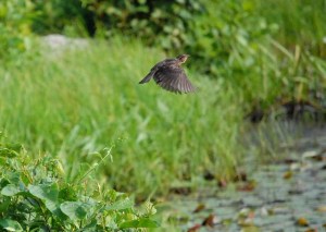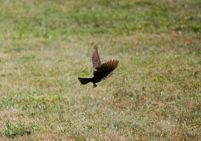 For the past few days, there’s been a scuttle of activity on the lawn at the far end of the pond. At first I thought it was a convention of female Red-winged Blackbirds. But because the birds are a bit more petite than the female, and a bit goofier in their flying skills, I’ve decided they must be fledglings. Although, it’s likely the mother, whose markings are almost the same, is still among them and may actually be in some of the photos here.