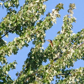 Once the bird landed, a summer breeze kept branches moving – obscuring it from my lens’ view. But I kept shooting, catching glimpses of it when the air current moved the leaves and branches in just the right way to allow me to see some of the bird’s neck and head. As I took these pictures, I had no idea what I was seeing. I joked later that I thought I had seen the Froot Loops bird. And when I downloaded the photos and saw them on the computer screen, the joke didn’t seem so far-fetched!