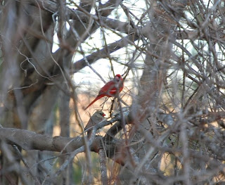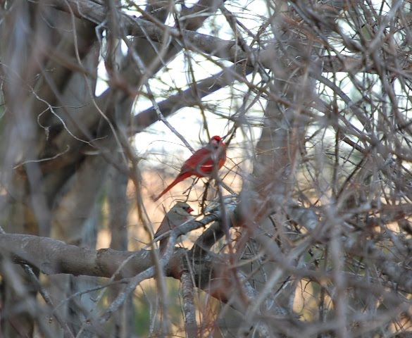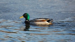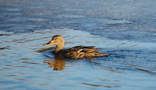 The natural environment does not make it easy to see all that’s happening. Under the cover of thicket, this cardinal pair alights for the joy of my eye and the capturing of them with my camera. What has come to signal the official start of spring for me (besides my birthday), is the arrival of the mallard pair. I’ve noticed that shortly after the ice along the shorline melts, the mallards arrive. Yesterday, I saw them for the first time. Here’s the male, skirting the edge of the ice.