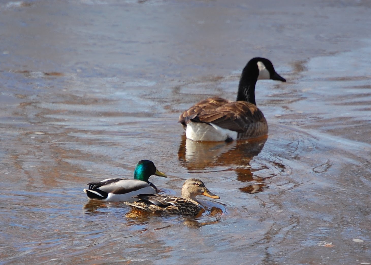 And at the same time, a pair of Canada geese have returned. In the photo below, goose and ducks paddle in harmony.