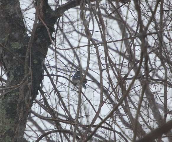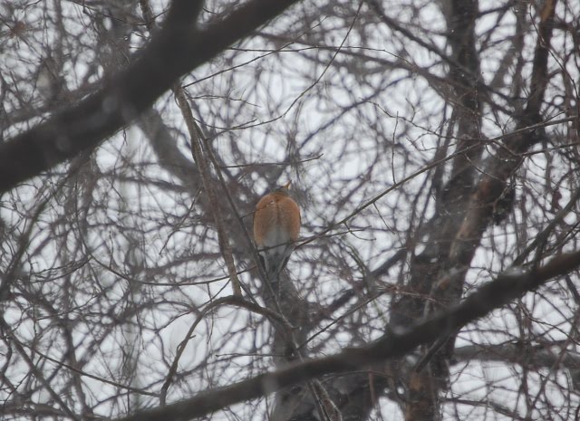 Despite the frigid temperature today and the falling snow, the birds were busy singing and perching and chasing one another. Above, a bluejay sits contentedly, as if all were sunny, warm and bright. And the robin below, as well as the dozen others in the same row of trees seemed to not mind the blast of winter that descended on the day.
