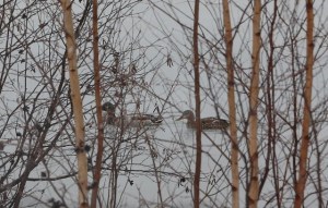 I’d forgotten how timid these ducks are. They get a bit panicky as I pass by and try to move away from me by going toward and attempting to step up onto the soft ice, which breaks apart beneath their paddle feet. I was glad that for the stretch pictured above, my favorite grove of birch trees gave them a sense of shelter. Please click on this photo to enlarge it and look at the beautiful eye of the female. I have referred to her “Cleopatra eyes” in past posts. They are beautiful and I wonder if nature influenced the black lined make-up of Egyptian women.
