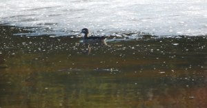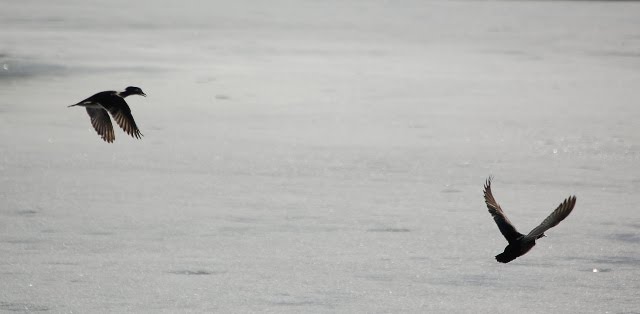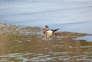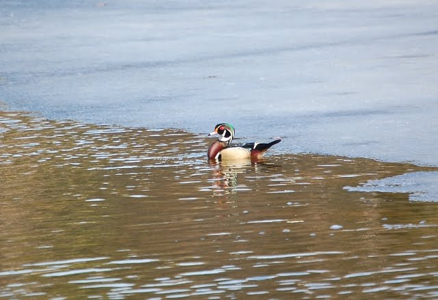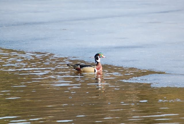 The wood ducks were neurotic in their uneasiness about me. I suppose it actually could be my four legged companion that has them more upset. In any event, they became frantic, noticeably agitated, as we walked along the path within thirty feet of them. They swam quickly to the ice and tried desperately to climb onto it. The ice was slushy and simply broke beneath their webbed feet. It was sad to watch their fear so I hurried us along and past them.