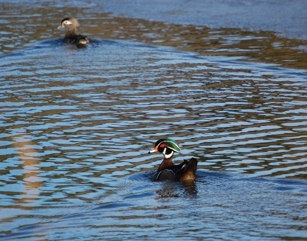 A couple of posts back I mentioned the wood ducks that visited the pond. I’d like to look at them again in this article. I’d never seen this duck before. I was taken aback by the male’s colorful and almost comical look. But like a clown face, there was something kind of eerie about the overall patchwork of disguise. And the red eyes of this bird topped it off.