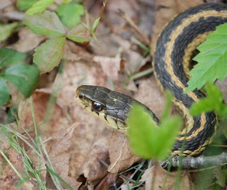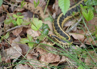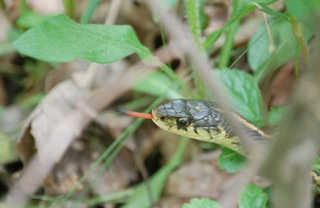As I cautiously approached the robins nest (in the post below) I nearly stepped on the head of this snake! I caught it out of the corner of my eye and did a two-step, missing it by inches.