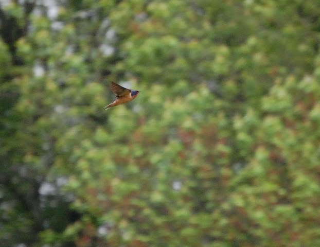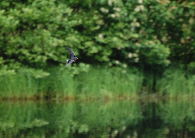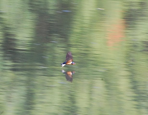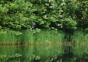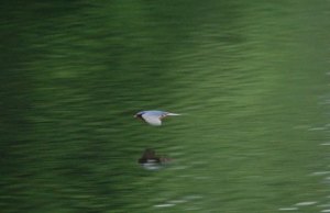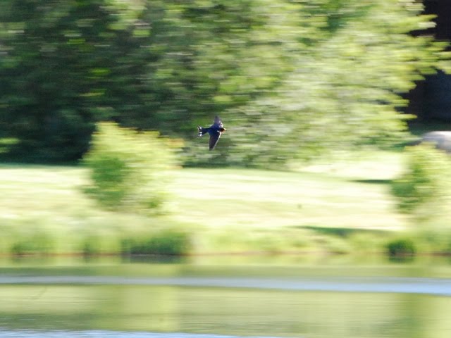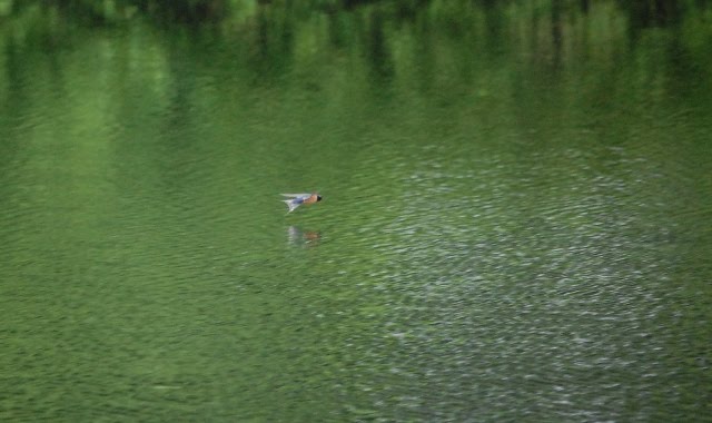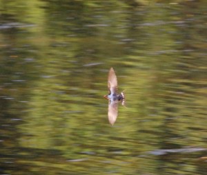 In the photo above, a barn swallow plucks from the surface of the water a tasty bug treat. Please click on the image and have a good look at it. (Use your back arrow to return to the post.) See the drag of the corner of the tail, for a couple of feet, as this bird dips its beak and skims the water’s surface as it flies at a ridiculously fast pace. The speed at which this bird constantly flies is hinted at in the image below.