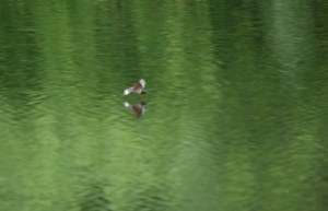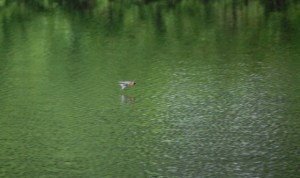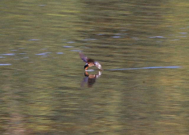 The photo below is of the water’s surface as I took yesterday’s pictures. It shows the banquet of bugs that I believe the swallow is dipping for at its leisure – hardly a difficult hunt.In a recent conversation with photographer Frank Winters, without using exact quotes he told me a bit about Henri Cartier-Bresson‘s thought that we get too hung up on perfect focus in photography. With that idea in mind, I share some photos here of the barn swallow that are a bit fuzzy around the edges! But I hope this gives you a sense of the speed of this bird.