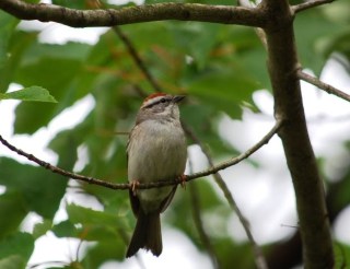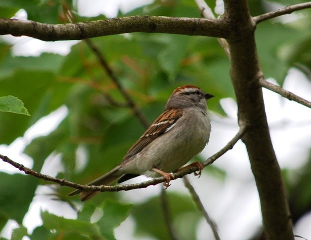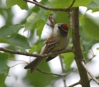 Here are more photos I took this week with my new Nikon 55 – 300 mm lens. The chipping sparrow is a small bird. It’s so petite, I always think it’s a baby bird. This one landed and posed on a branch for me yesterday. It showed me its profile, displaying its eye color and markings and its beak shape and size (above), its wing stripes (below), and (below still) its crown view, as well as the cut of its tail feathers! It seemed to know just what the bird books are looking for!