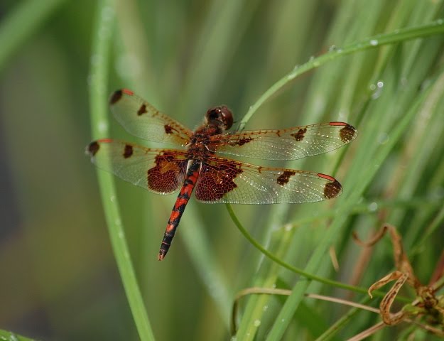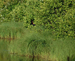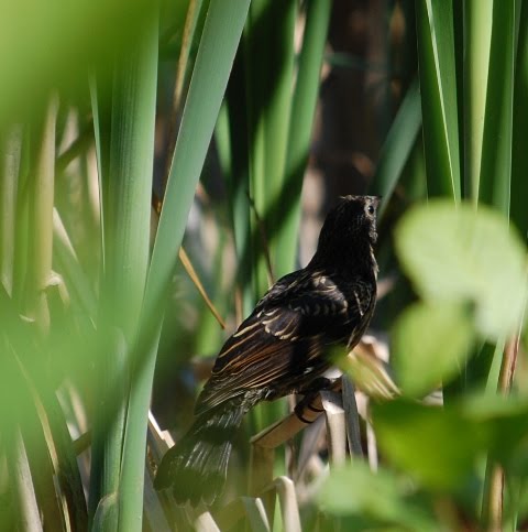 This time of year, I can hear the juvenile red-winged blackbirds in their nests at the base of tall reeds in one corner of the pond. They fly in and out, and I am able to take their pictures as they get used to walking in the grass or balancing near the tip of a reed. But never, till the photo below, have I seen a juvenile in the darkness of the lower reeds. Using the full 300mm power of my new lens, I was able to get this shot, as evening light filtered through and illuminated the bird just enough. And it was so easy to get this photo of the Elisa skimmer.