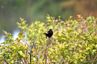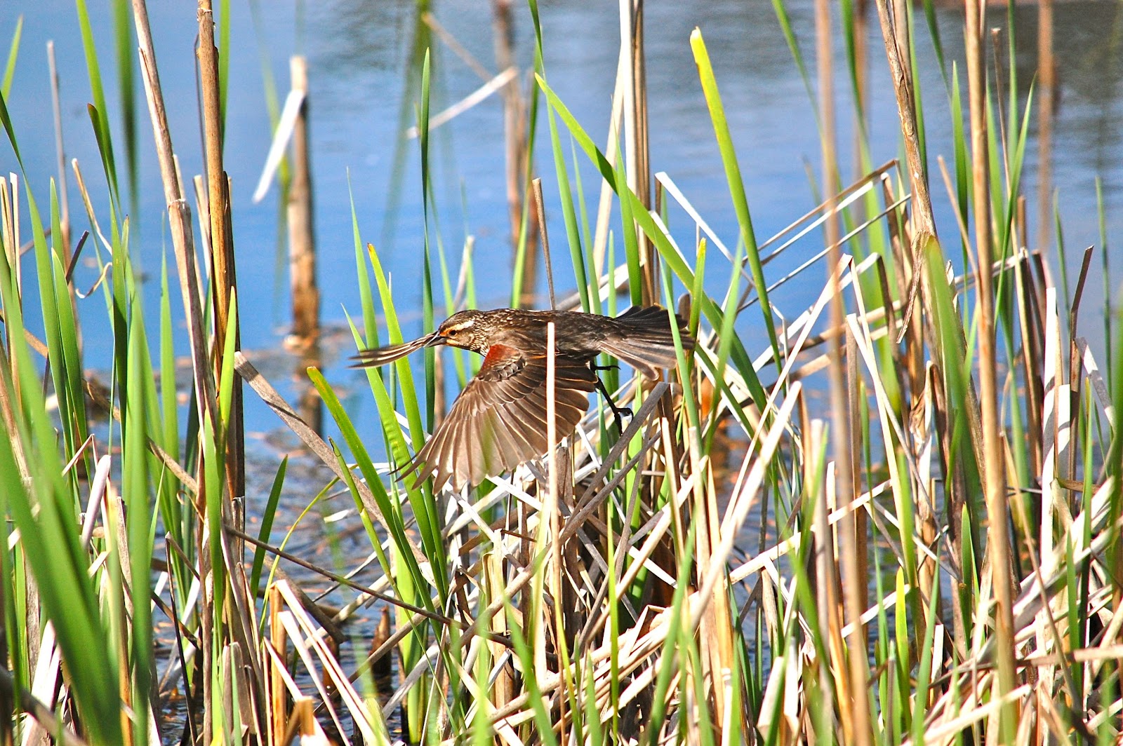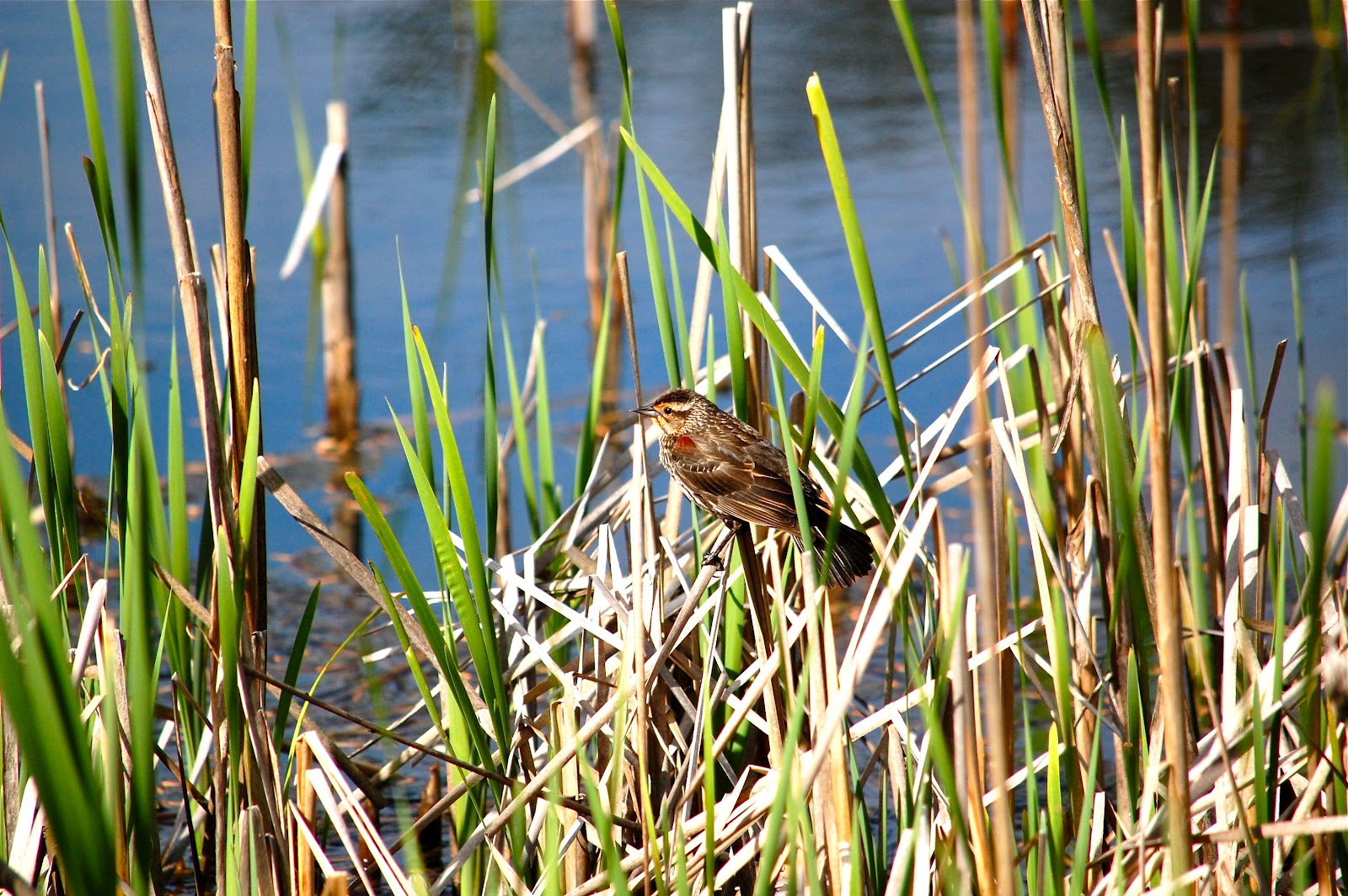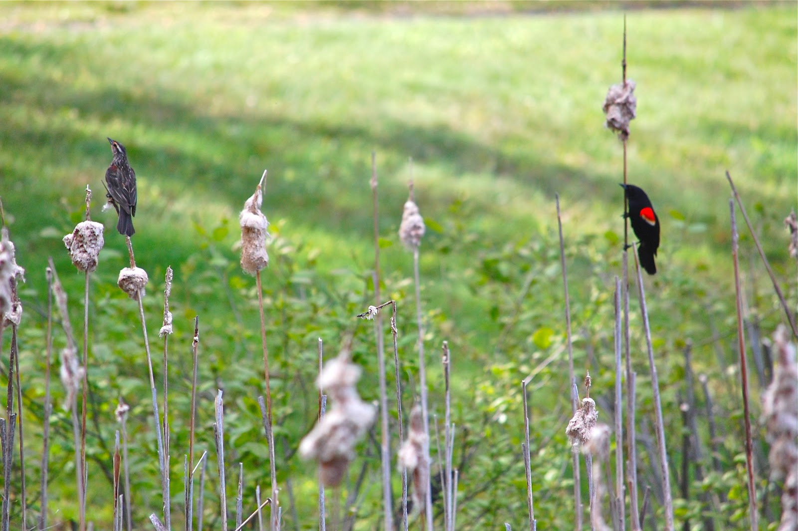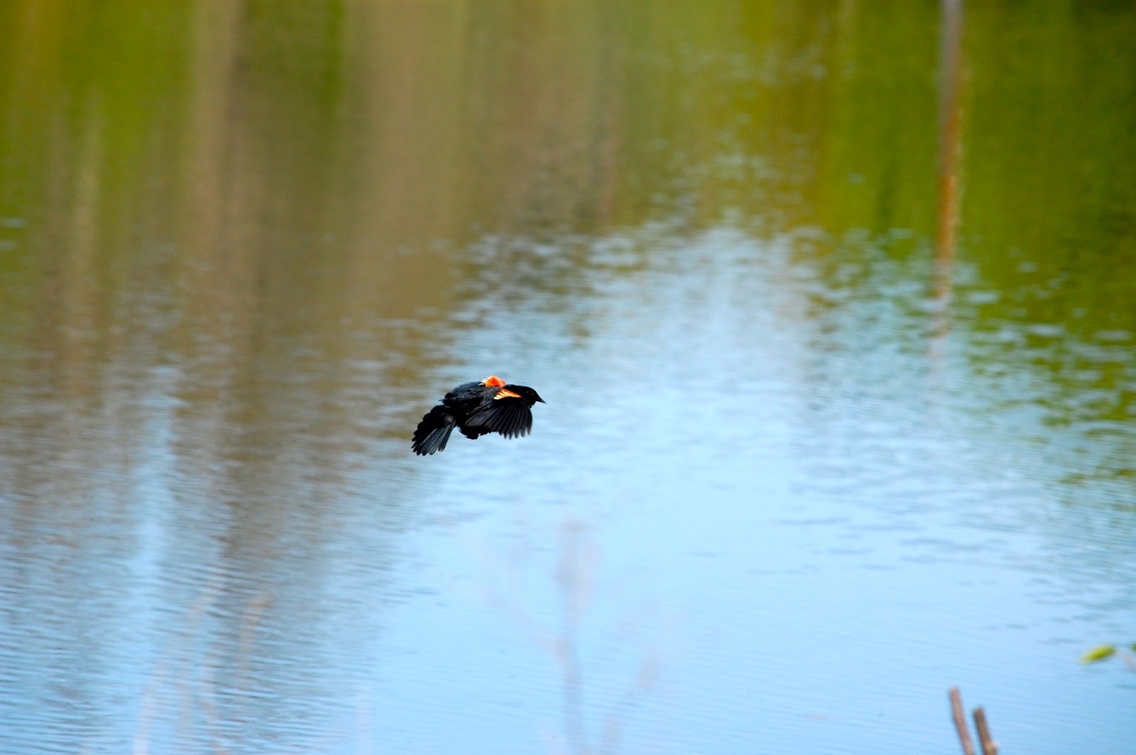Based on my observation, each season, the red-winged blackbird males arrive several days before the females. The male is black, except for a brilliant red flash on his shoulder and a strip of creamy yellow that runs along the lower edge of the red. Depending on the season and things about mating that I’ve not determined, his red is more or less visible. For the past week, his red has been very evident. These birds seem to have established their nesting area, as always, low in the reeds in one corner of the pond.