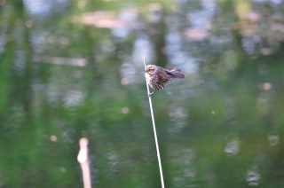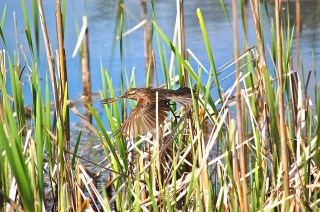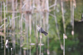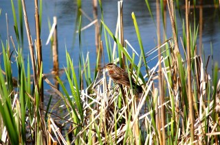 The male is always visible, displaying a strong and confident manner. Several males will perch in the scrub along the pond’s shore, and they click, whistle and call raucously to each other (or to the females?), and they spar in the air over the nesting area. All the while, a flicker here or there, deep in the reeds, might catch my eye, making me aware that the females are present, in a far more low-key way.