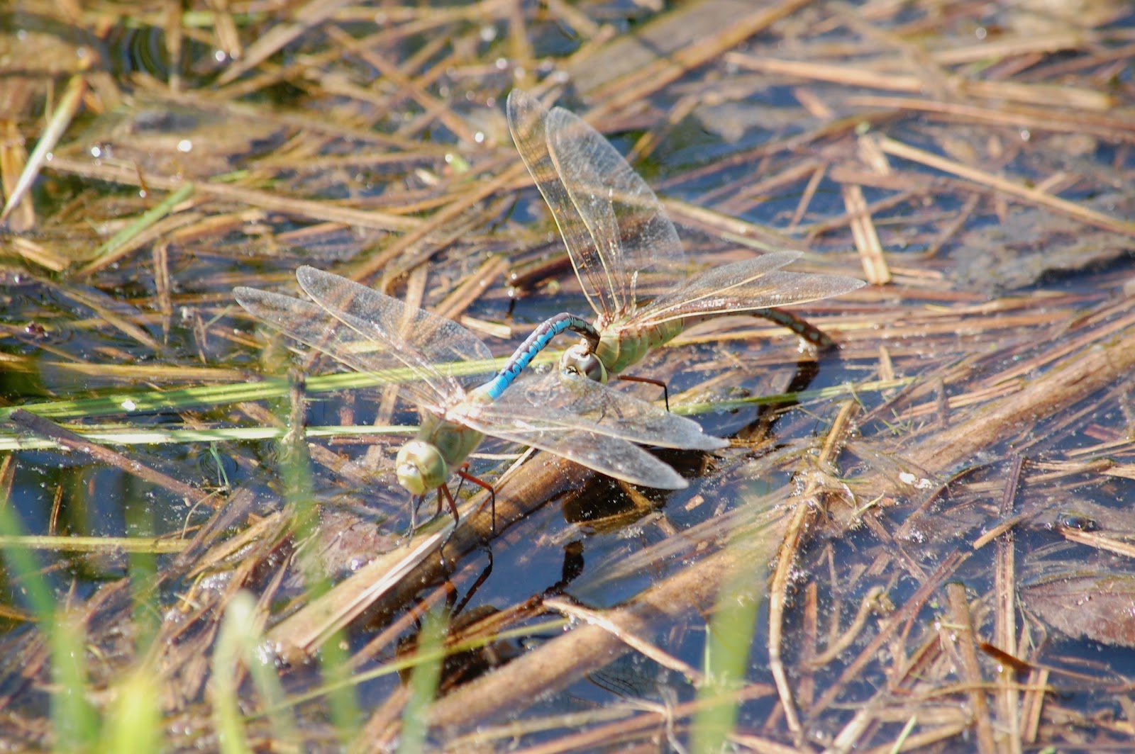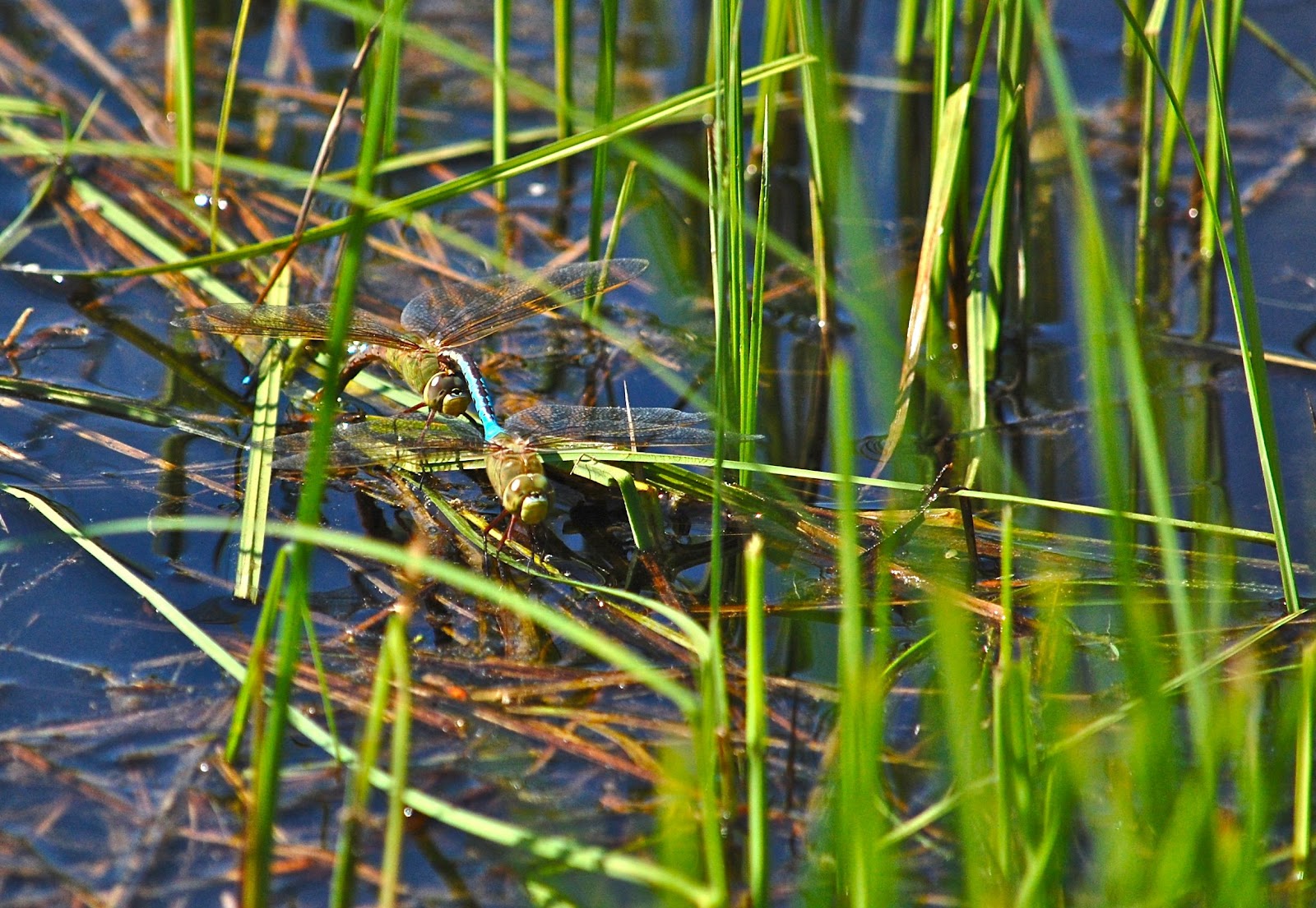Yesterday, the brilliant, light blue body color of the male darner caught my eye as it sat in the old and new grasses alongside the pond’s edge. Looking closely, I could see that it was attached to a female, in a way that reminds me of the refueling of a jet, mid-air. Research tells me that at this point the mating for reproduction has occurred and the attachment is to serve the purpose of keeping any other male from mating with this female. I get the sense this has more to do with keeping pure the gene pool than possessiveness!
